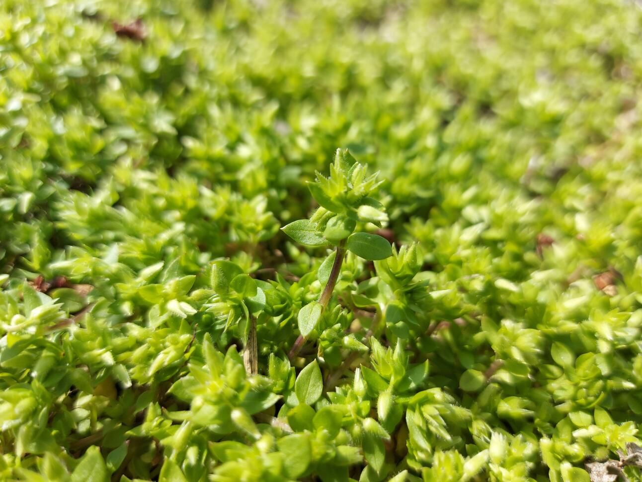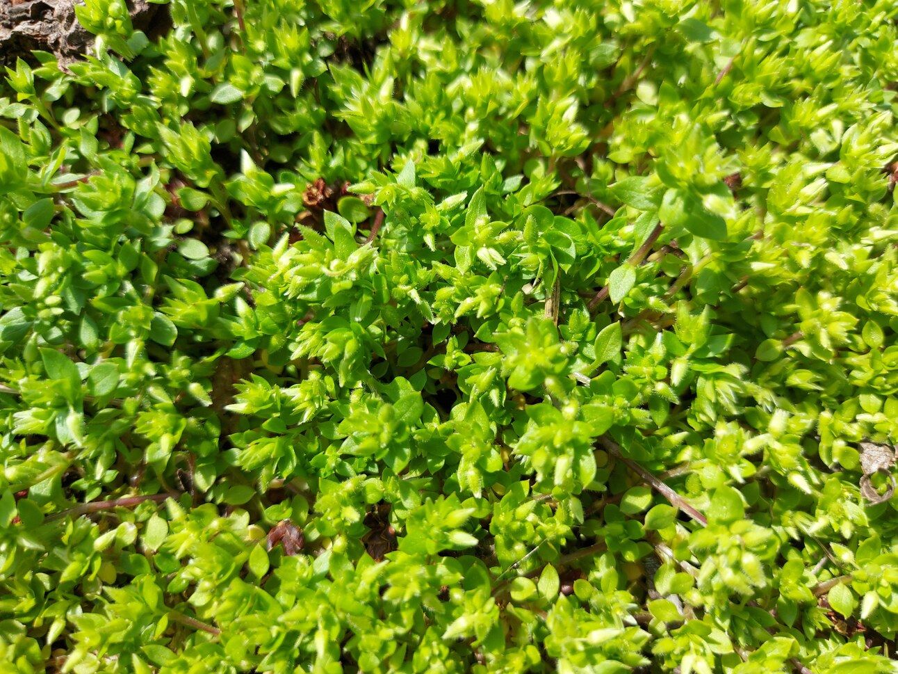 Key Identifiers: Grows in large, tangled mats of greenery that resembles moss from a distance. They have distinct white flowers, and a single line of hairs going down the stem.