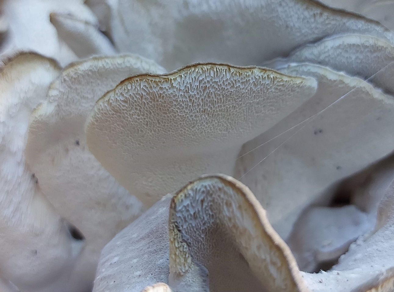 Key Identifiers: Dense clustered growth with creamy white PORES on the underside. The top sides are typically gray to light brown. The “fronds” typically grow in a rosette-like formation around a single stem point. Flesh doesn’t change color when cut.