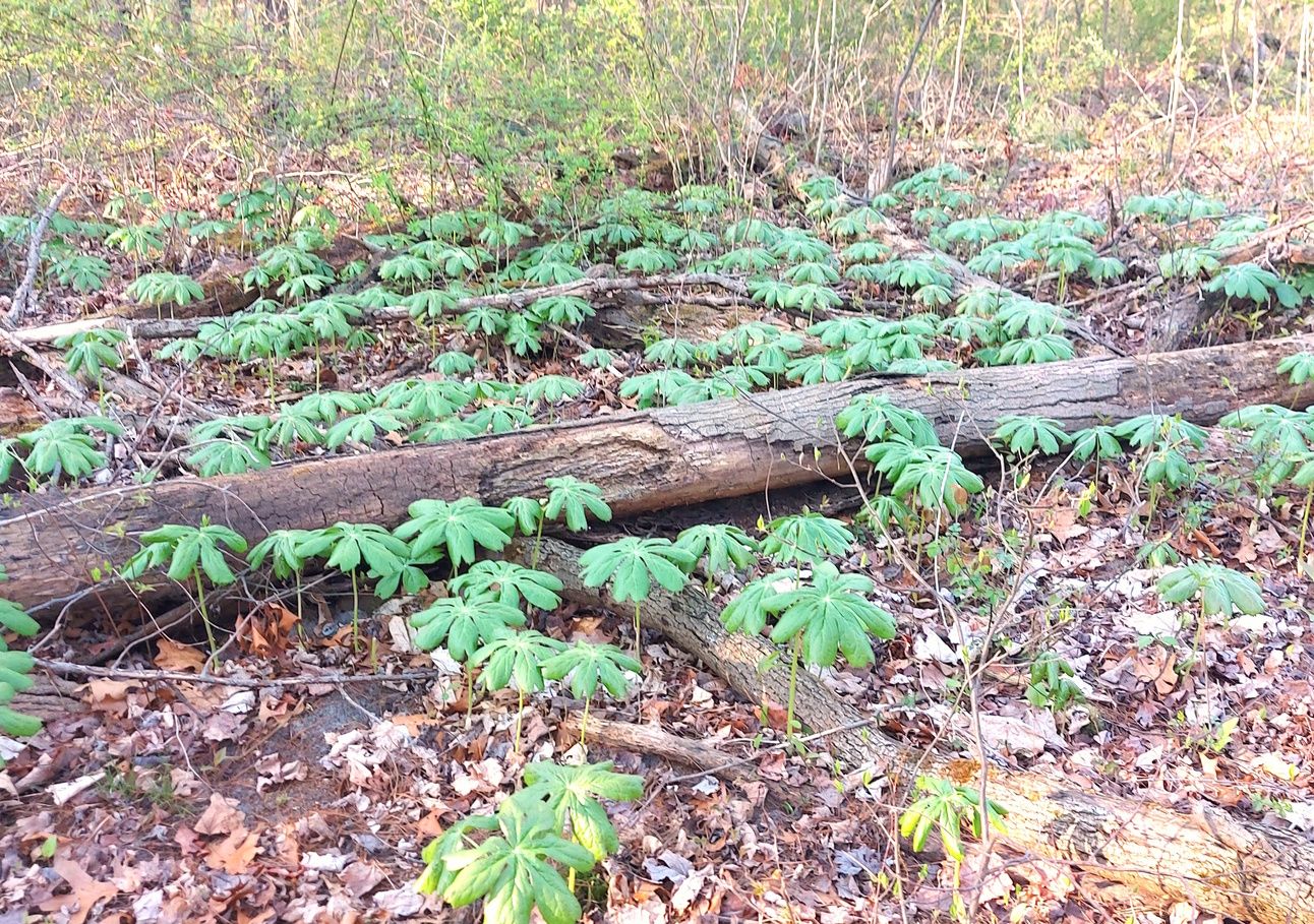 Mayapple grows in large patches that peak in spring and start to die back over the course of the year.