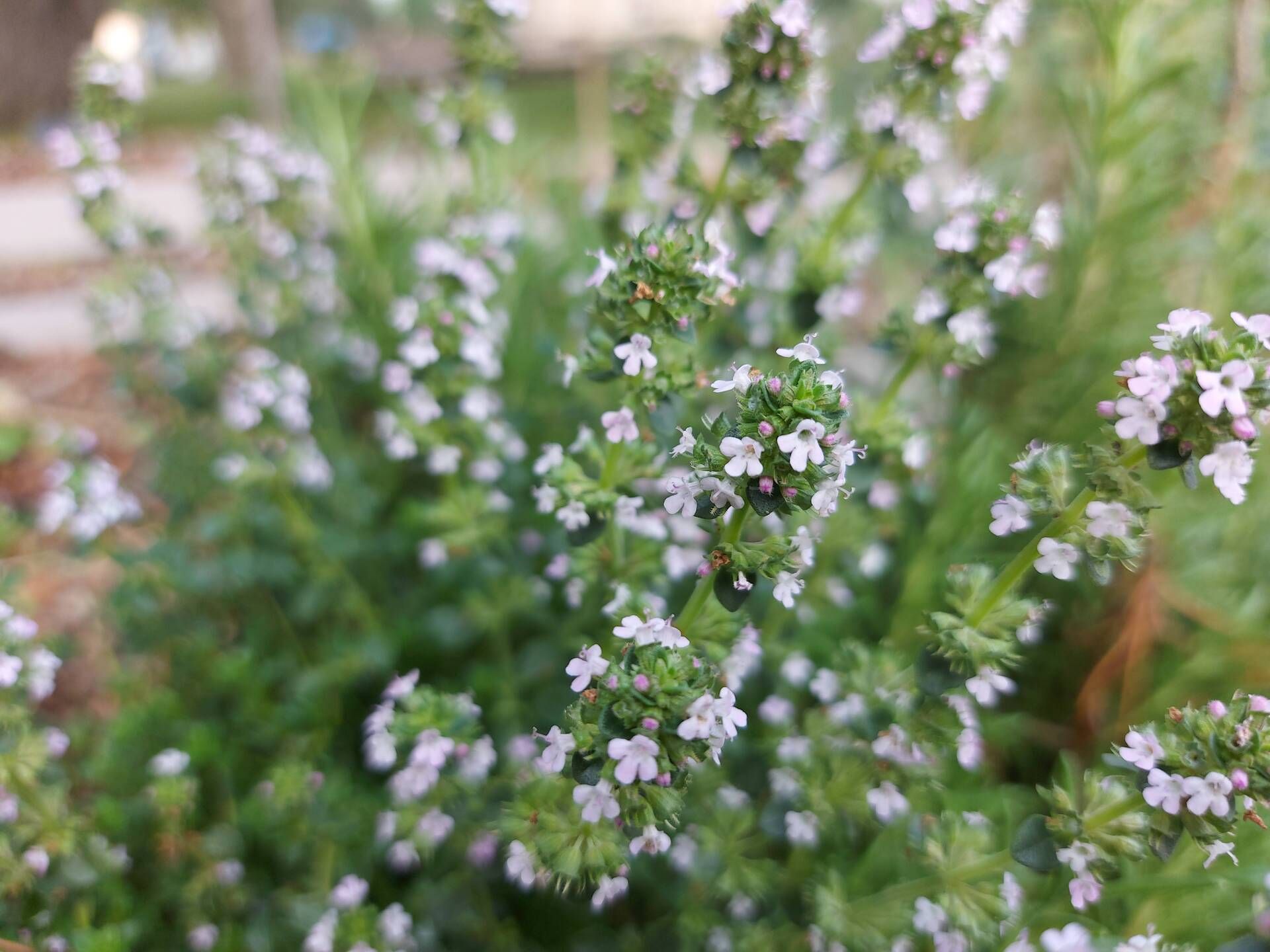 Some species are different, but the most commonly cultivated thyme (Thymus vulgaris) has very tiny delicate leaves with even smaller white-pink or purple-ish flowers that appear in summer.